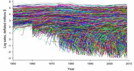 This graph shows the sizes of 30,000 publicly-traded companies, with sales leveling off as companies reach maturity. Sizes of 30,000 U.S. Companies 1950-2009 Hamilton and Daepp/Santa Fe Institue