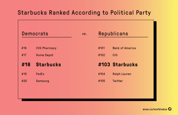Some brands, like Goodwill, Amazon, and Google rank consistently well across different types of people—across political persuasions, age, income levels, and attitudes. Starbucks’ stand on hiring immigrants draws admiration from some, and scorn from others. [Image: courtesy Enso]